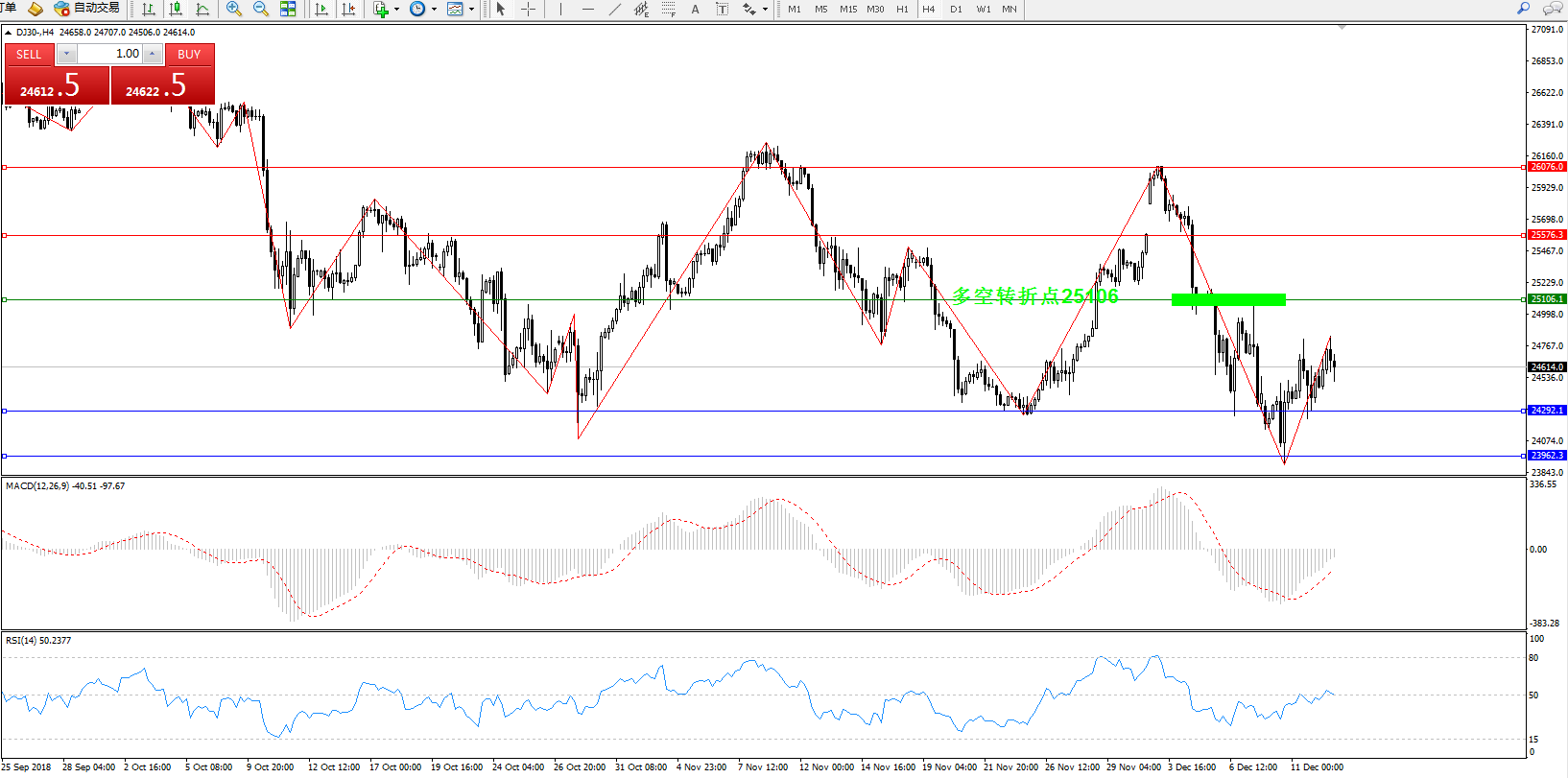 道琼斯指数DJ30——4小时K线图显示: