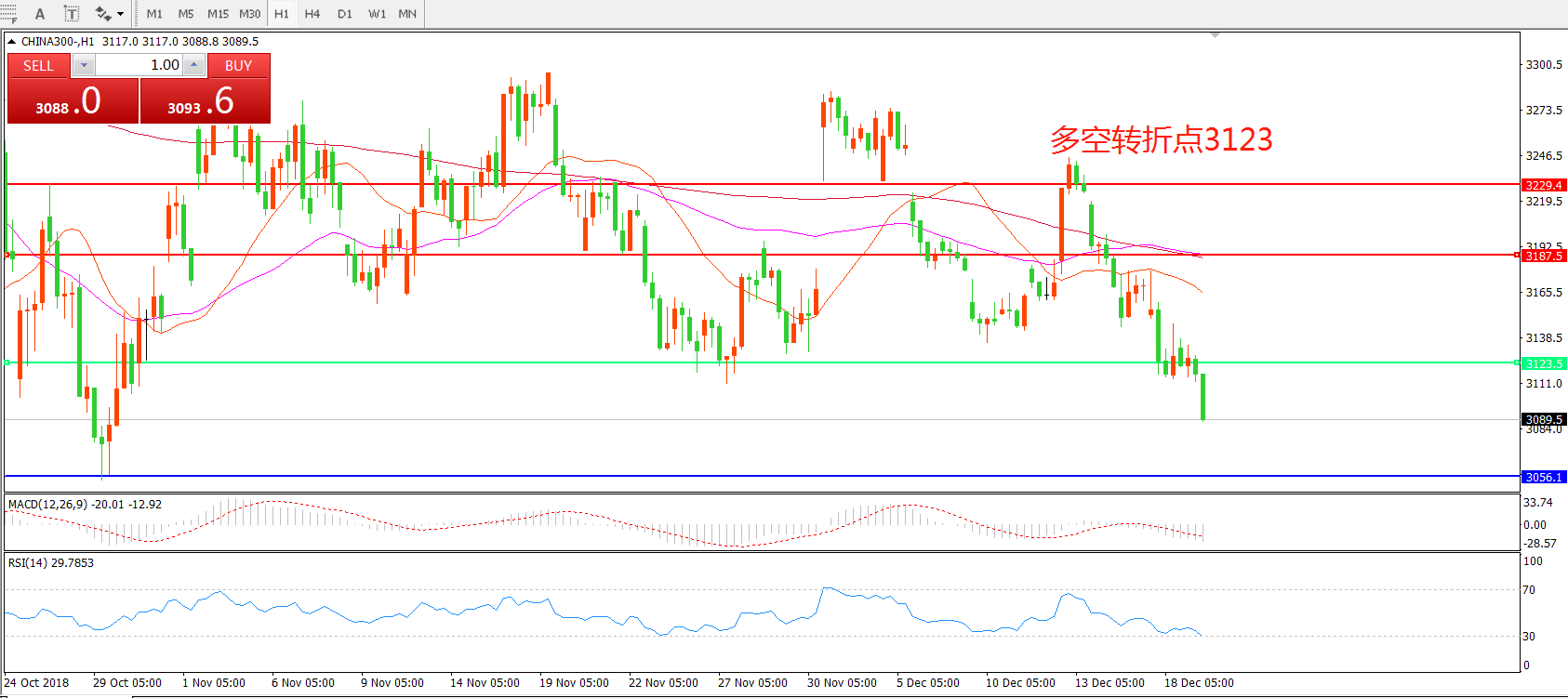 1小时图看,CHINA300中华指数、走势疲弱,均线系统呈空头排列,KDJ、MACD指标持续下行,短线继续下探的可能性。