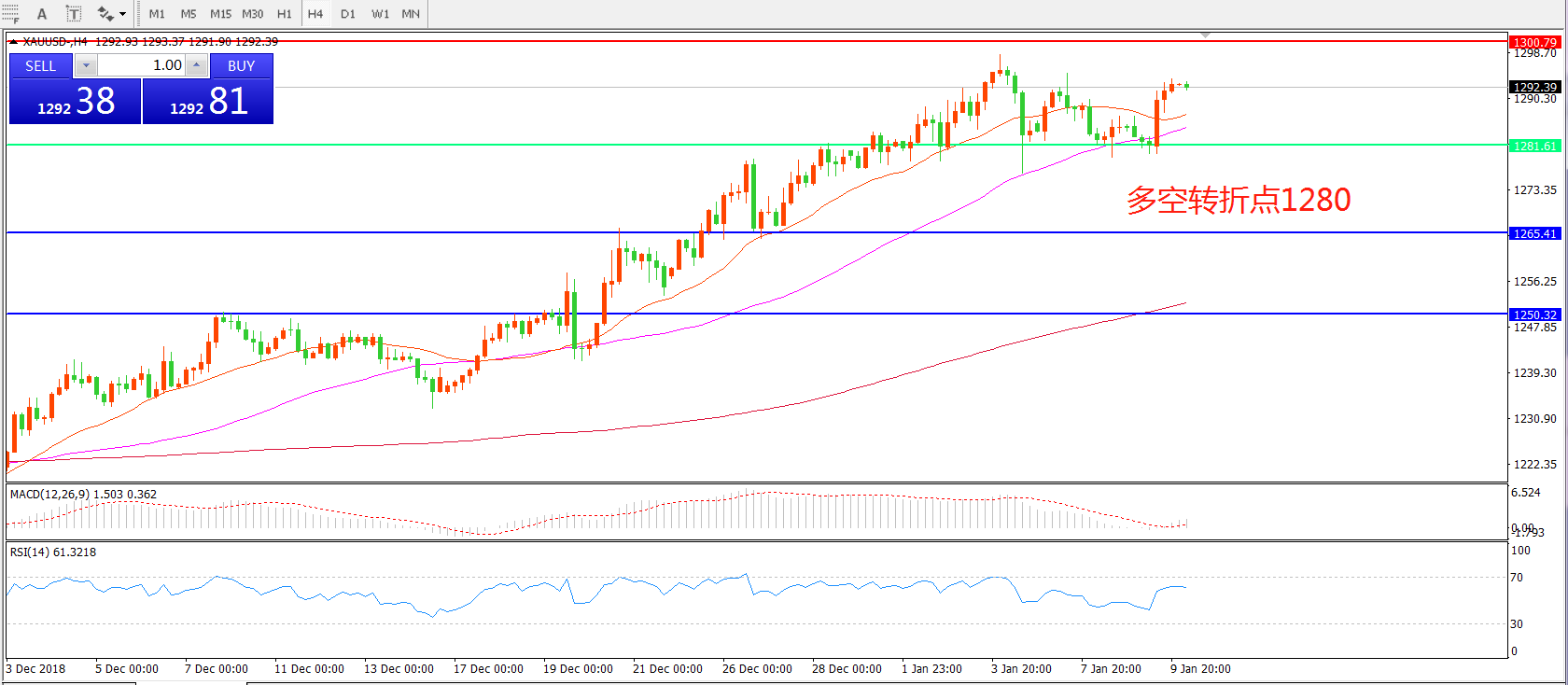 交易策略:在1280.00之上看涨,目标1300.00  1319.00