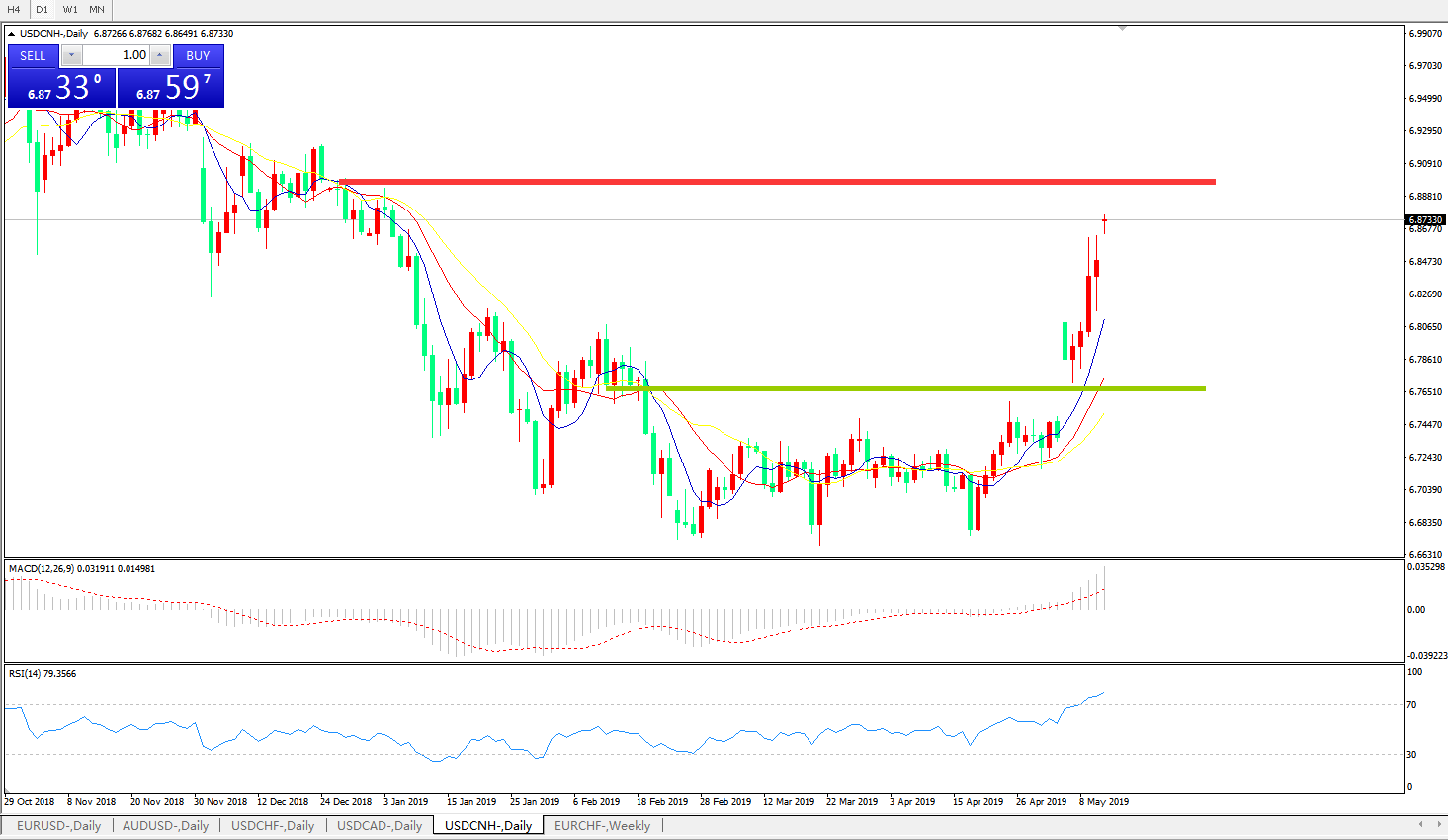 交易策略6.7560之上,看涨,目标价位为6.8585,然后为6.9200