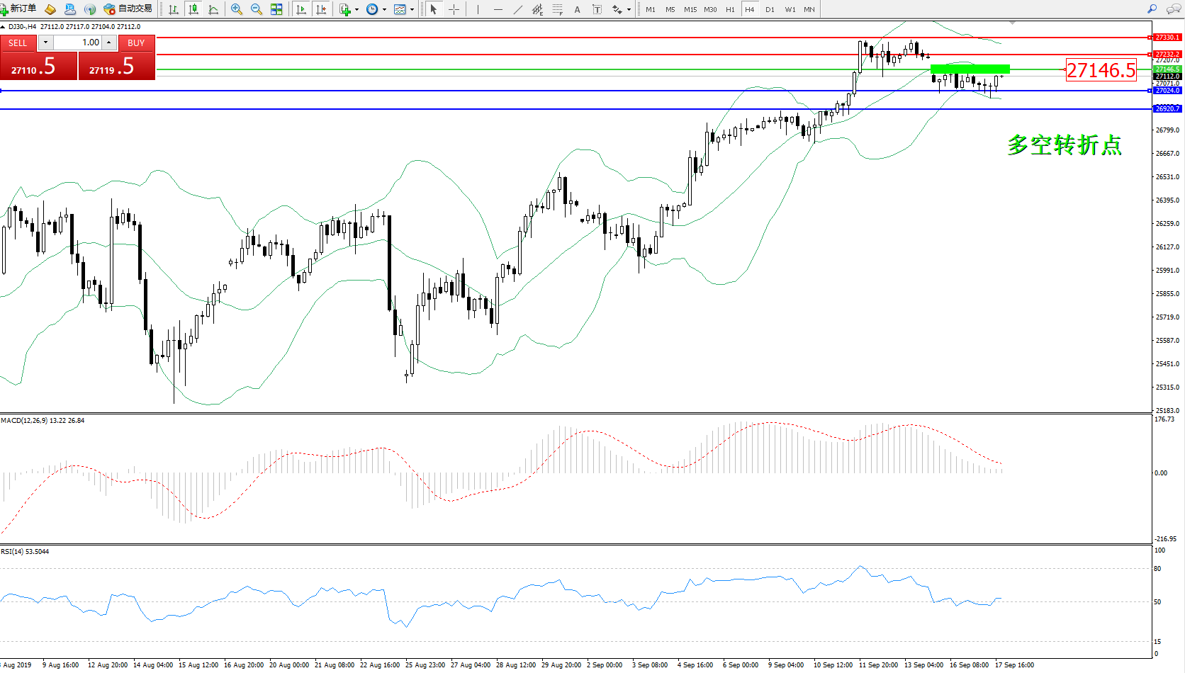 道琼斯指数DJ30—— 4小时K线图显示: