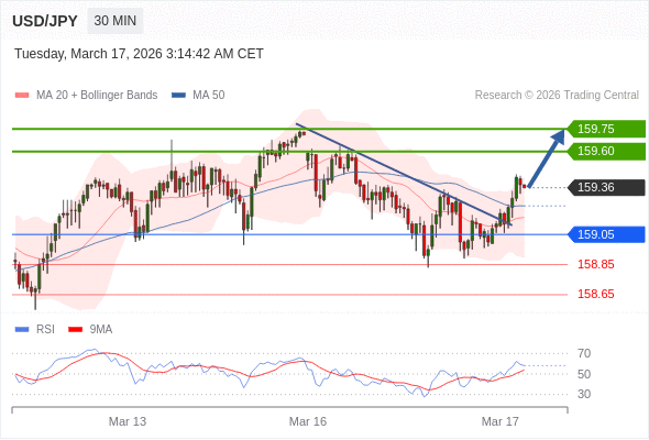 在 159.05 之上,看涨,目标价位为 159.60 ,然后为 159.75 。