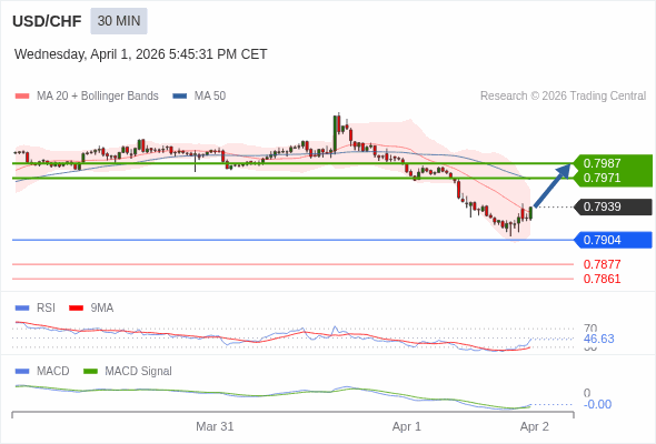 美元/瑞郎 当日内 : 有上涨的可能,目标价位定在 0.7987 。