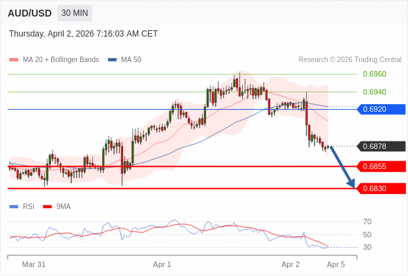 交易策略: 在 0.6920 之下,看跌,目标价位为 0.6855 ,然后为 0.6830 。