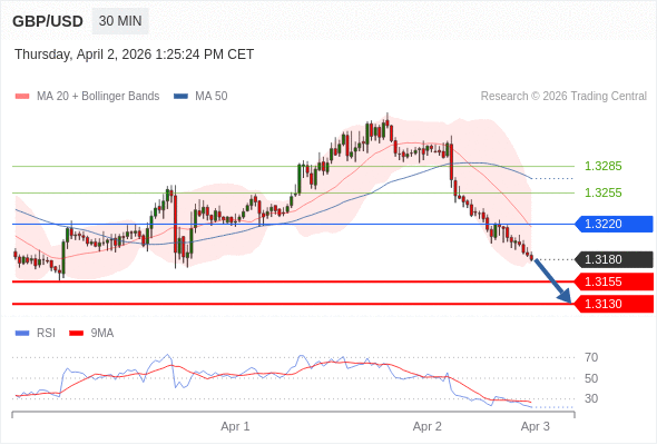 交易策略: 在 1.3220 之下,看跌,目标价位为 1.3155 ,然后为 1.3130 。