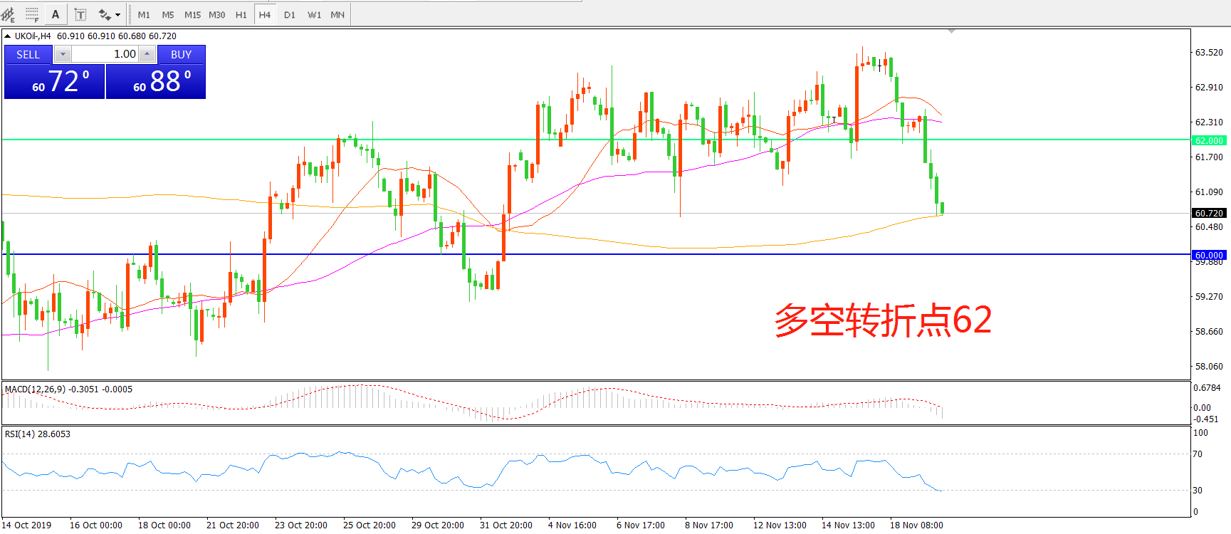 交易策略:在62.00之下看跌,目标60.00    57.50