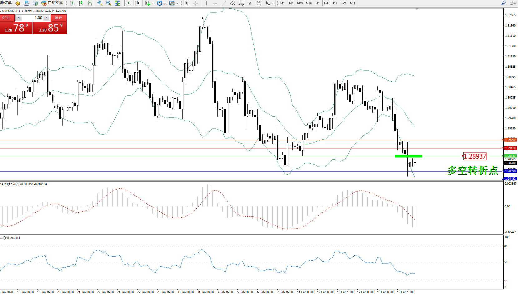 交易策略:1.28937下方看跌,目标1.28598、1.28432