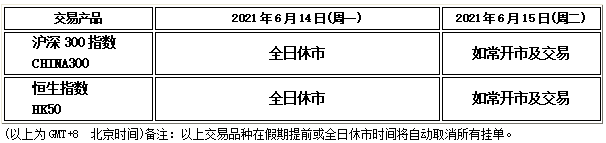 因应2021614(周一)中国市场端午节假期,沪深300指数和恒生指数将于假期期间全日休市,敬请阁下留意知悉
