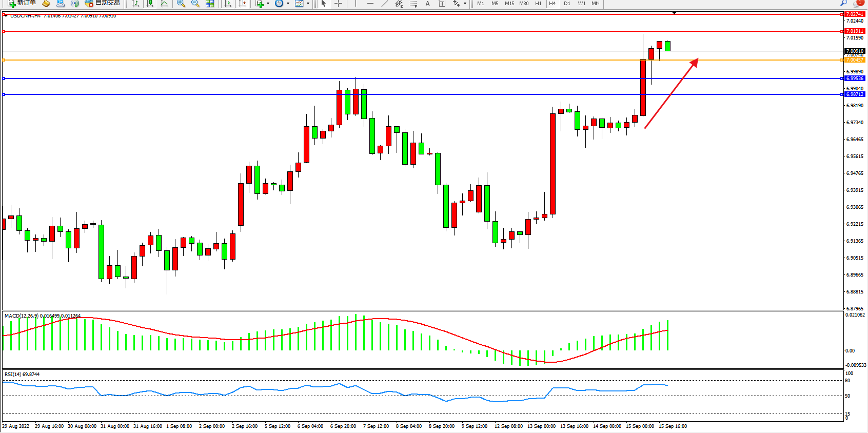 交易策略::7.00457上方看涨,目标7.01911、7.02741