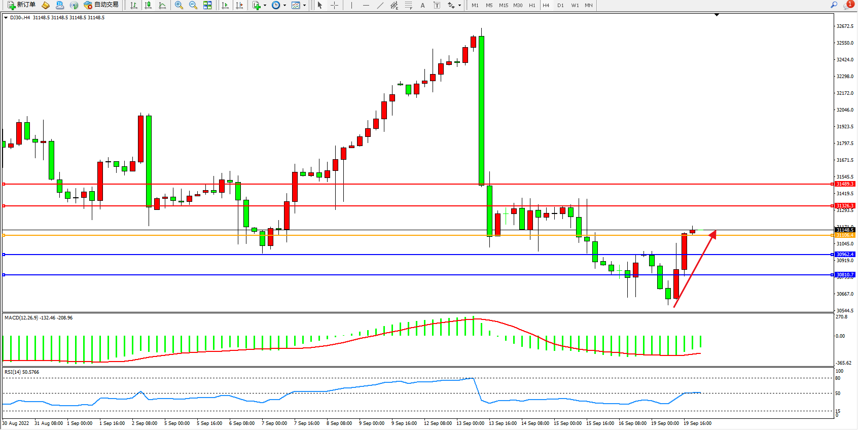 道琼斯指数DJ30——4小时K线图显示: