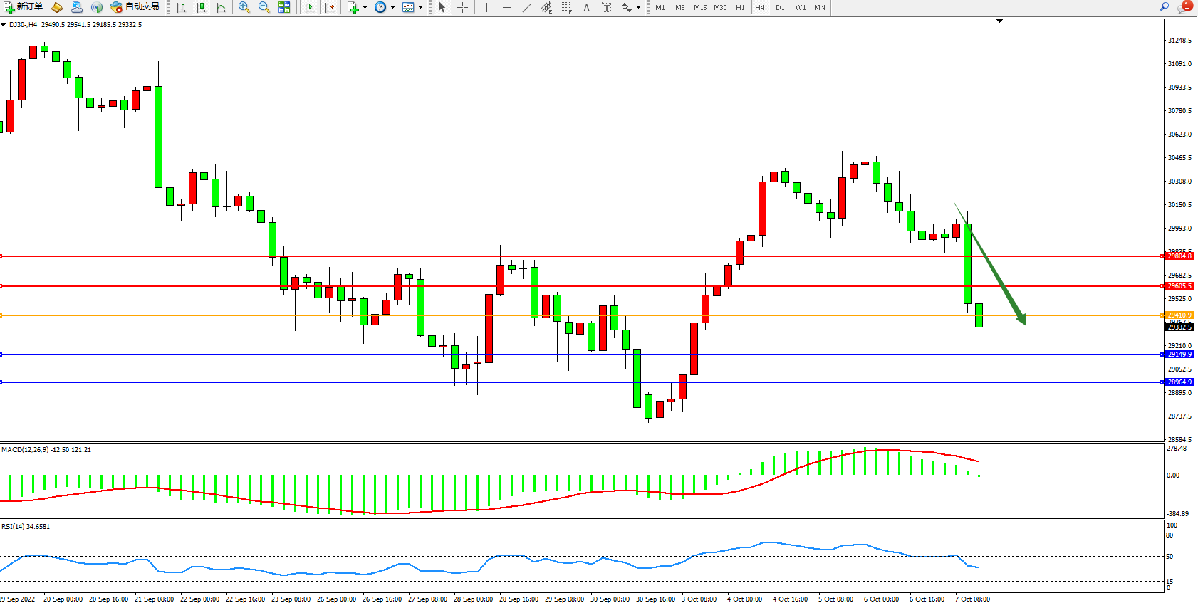 道琼斯指数DJ30——4小时K线图显示: