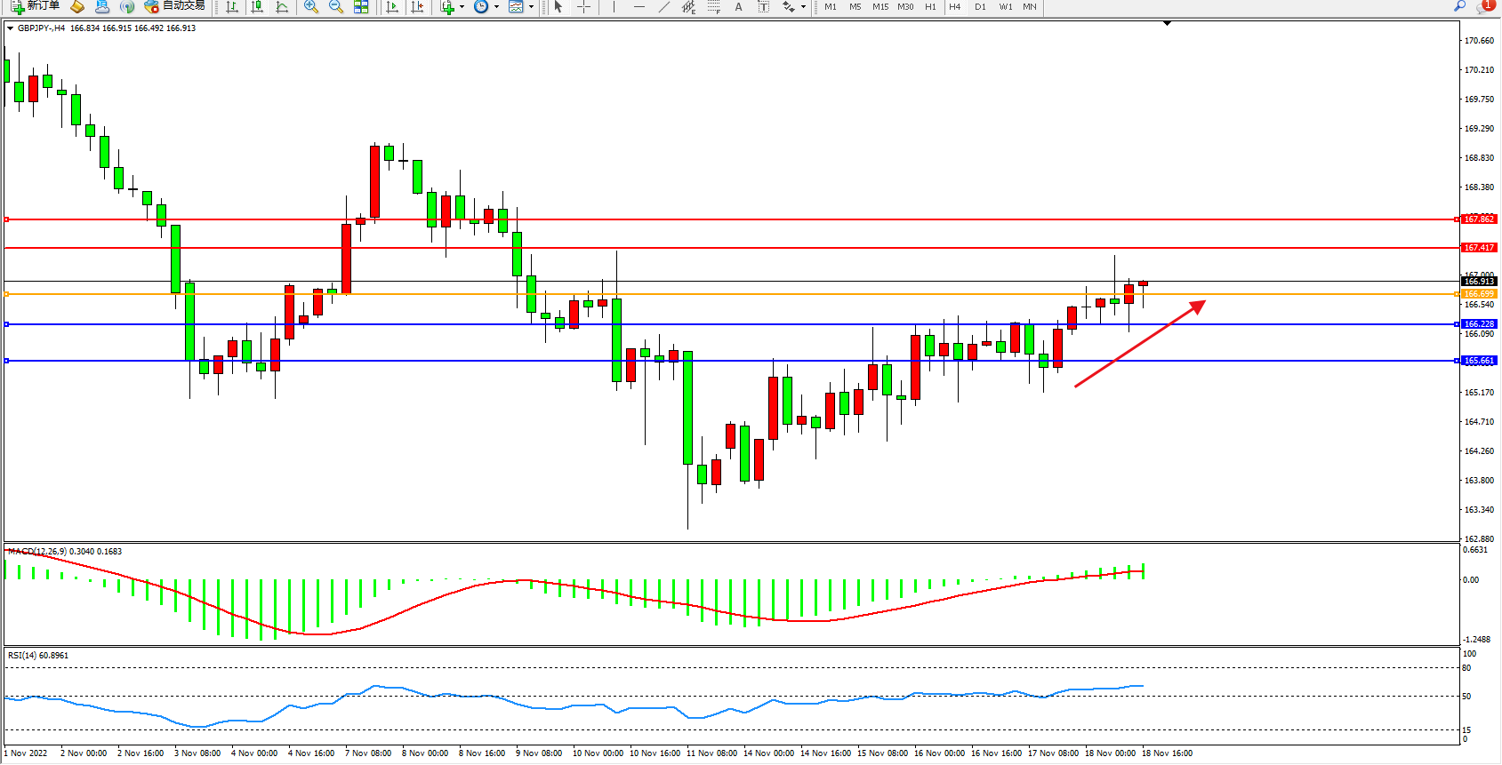 交易策略: 166.699上方看涨,目标167.417、167.862