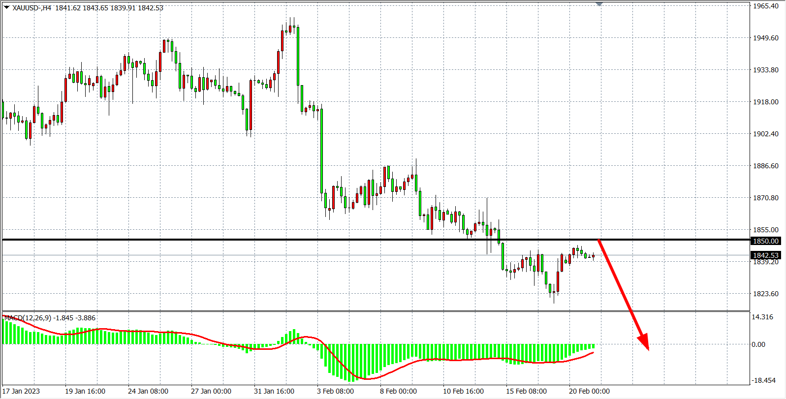 交易策略:在1850.00 之下看跌,目标1820.00         1800.00