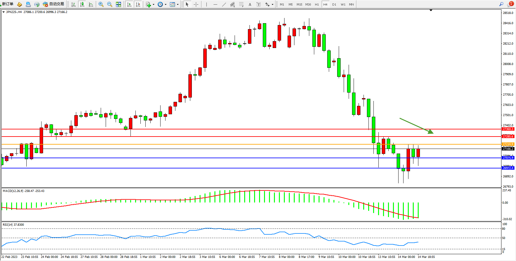 日经指数JPN225——4小时K线图显示: