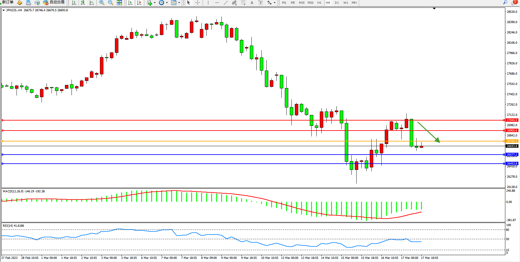 日经指数JPN225——4小时K线图显示: