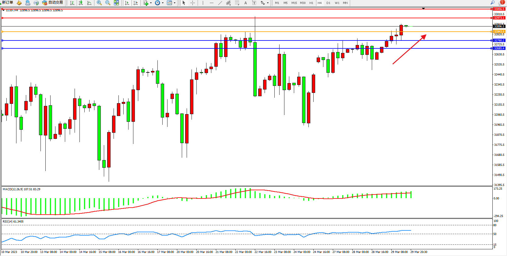 道琼斯指数DJ30——4小时K线图显示: