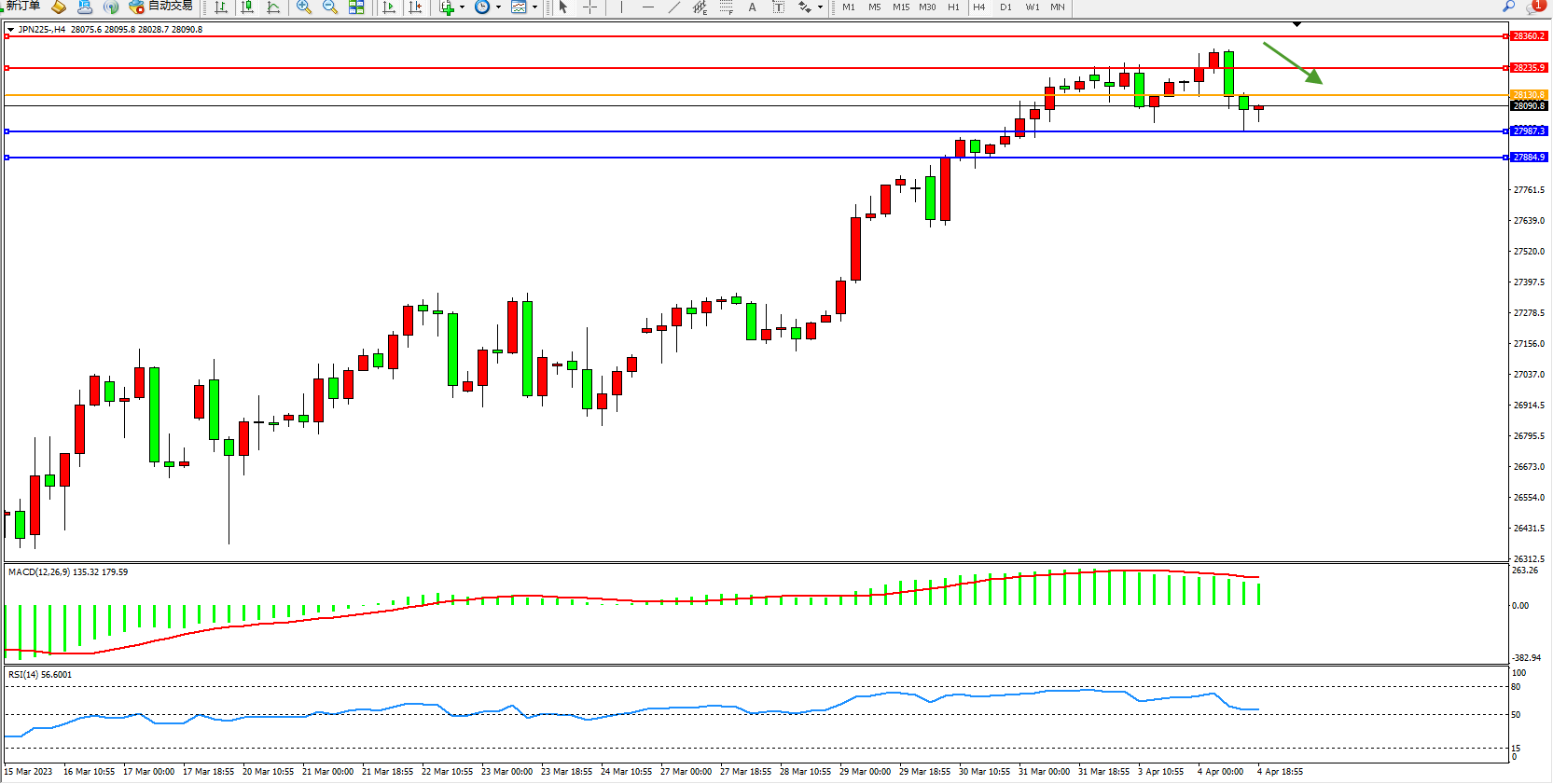 日经指数JPN225——4小时K线图显示: