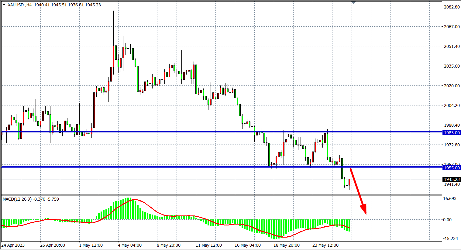 4小时图看,黄金跌破1955支撑后跌势继续扩大,MACD量能在零轴下继续放量,行情延续弱势,目前1955已转化为短期阻力,日内该位之下看1935-1920附近。