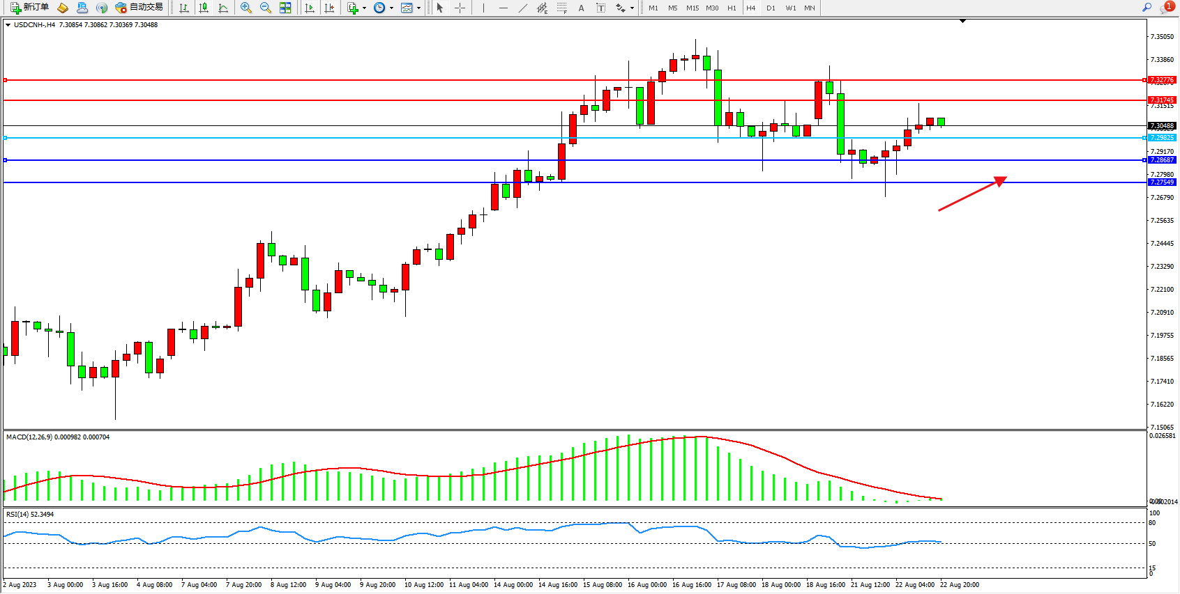 交易策略:7.29825上方看涨,目标7.31745  7.32776