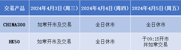 因应2024年4月4日(星期四)为清明节假期,本公司以下产品的交易时间将于假期期间作以下安排,敬请留意。