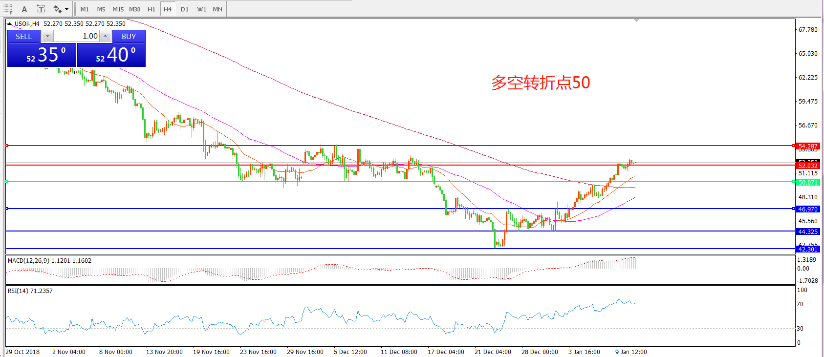 4小时图看,油价站稳50美金后稳步上行, 21与55均线形成金叉,MACD红柱缩短,RSI指标处于超买区域拐头,短线有回落风险,但整体走势偏多。